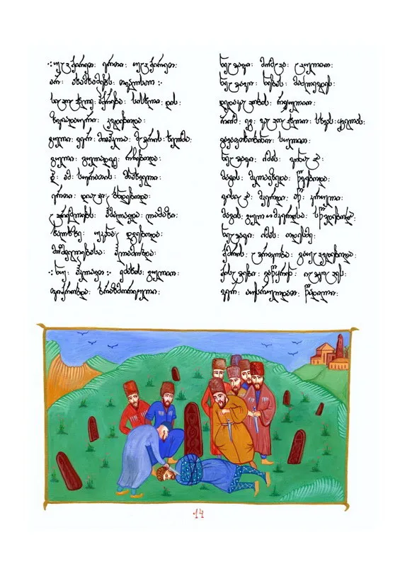 After finishing the text, I painted two scenic miniatures in advance, in the layout-defined places. Of course, I tried numerous sketches and styles beforehand. Due to graphic design orders, I had little time for the book. I decided to invite a young icon painter, Ketavan Kavazauri, to the project. Such collaboration seemed interesting to me. After all, ancient manuscripts often involved teamwork.